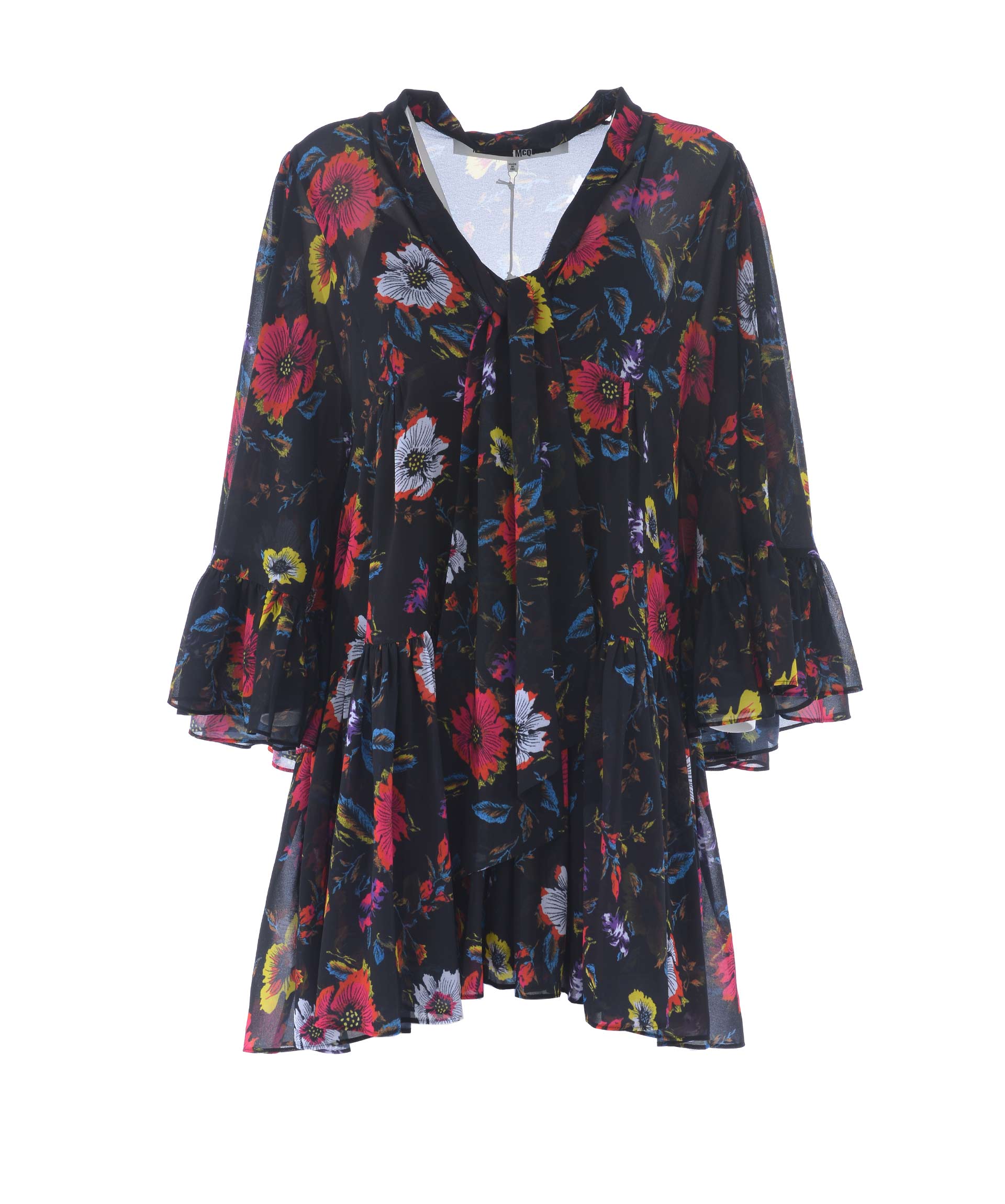 Abito MCQ Alexander McQueen in georgette Nero stampa floreale multicolor. Scollo a punta con foulard da annodare. Manica lunga ampia con balza. Balza al fondo. Foderato con sottoveste removibile.