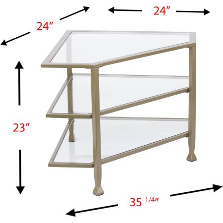 -. Feature : TV stand accommodates a flat screen TV up to 33.25"W overall | Simple, minimalist look | Supports up to: 85 lb. (top), 20 lb. (each shelf) / Corner convenient design | 2 open glass shelves and spacious glass top | Living room or open concept living space | Approx. weight: 31 lb. / Contemporary to transitional style | Matte khaki | Overall: 35.25"W x 24"D x 23"H | WallP.R.Int: 24"W x 24" W / Assembly: Easy to assemble | Top: 35.25"W x 24"D x .5" THK | Shelves: 34"W x 21.25"D x 8.25"H, 23.25"W (full shelf, opening) / Glass surfaces: 33"W x 22"D, 32"W x 19"D (top, shelf) | Clearance: 20.5"W x 21"D x 5"H | FootP.R.Int: 23.25"W x 23"D | Materials: Powder-coated iron, 5mm tempered glass