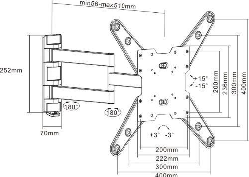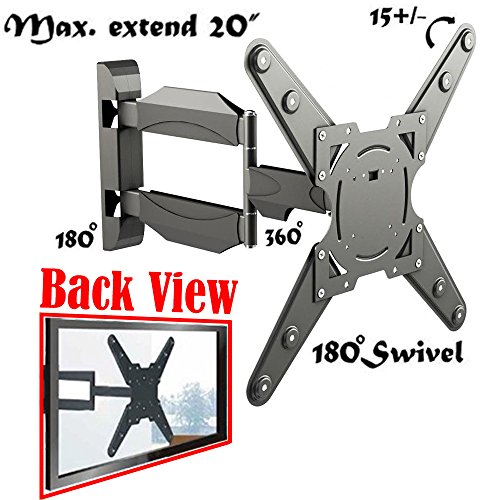 -. Binding : Electronics -. Brand : 2xhome -. Color : Black -. EAN : 0609722631501 -. Feature : Fits 26" to 55" TVs with VESA Compatibility of 75x75mm to 400x400mm (Adaptor Plates are included for 300x300mm and 400x400mm VESA Mounting) / This Bracket is Universal and will Fit 99% of all makes and models of TV within the stated size range (26" to 55") Max VESA Dimensions 400 x 400mm / Cable Management System to hide and secure your Television's loose cables and wires / 15° degree Tilt, 180° Swivel and 3° left & right screen adjustment. Max weight capacity: 88lbs. / Easy to use(IKEA style) full instruction manual; FREE basic hardware included -. Label : Dapper Cut -. Manufacturer : Dapper Cut -. ManufacturerPartsWarrantyDescription : Life Time warranty -. Model : SHB120E -. MPN : 18.50 -. PackageQuantity : 1 -. PartNumber : 18.50 -. ProductGroup : Speakers -. ProductTypeName : CONSUMER_ELECTRONICS -. Publisher : Dapper Cut -. Studio : Dapper Cut -. Title : 2xhome - Full Motion Articulating Swivel ARM Corner Single Stud Tilt LCD LED Tv Monitor Wall Mount 14 22 32 36 40 42 55 -. UPC : 609722631501