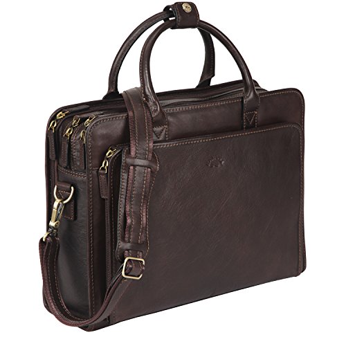 -. Feature : Italian vegetable tanned leather, matched with anti brass hardware / Multiple gussets design. Top-zip closure / Top handles with 5.25 inch drop, snap tag closure. Additional detachable and adjustable shoulder strap, longest drop 21.5 inch / Exterior front 1 x zippered compartment with 2 x pen slots+ 2 slip pockets. 1st main gusset with 3 x slip pockets, 2nd one with padded sleeve fits up to 15 MacBook Pro, 3rd one with 2 x slip pocket + 1 x zippered pocket. Exterior back 1 x snap compartment + 1 x zippered pocket / Dimension: 15.25 L * 5 D * 11 H inch. Padded sleeve fits up to 15 MacBook Por and most model 14 inch laptop