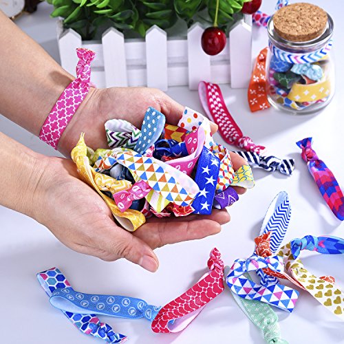 -. Feature : Colorful fashion hair ribbon: 100 x elastic hair ties in 50 different styles, meeting your various need to match wear style, change styles and catch eyeball everyday / Gentle on your hair: made from soft stretchy material, durable and won't fade, soft hair ties won't pinch, tug or pull your hair, comfortable to use / Keep hair natural: soft elastic headbands hair ties leave no crease and indent marks on your hair after taking down the hair bands / Useful for medium to thick hair: elastics measure 0.6 inch wide, effective part perimeter is about 6 inch (before stretching), hold ponytail tight while working or playing / Wide usage: elastic hair ties with bright color and nice patterns can serve as cute bracelet and anklet, great gift for baby, girls and women