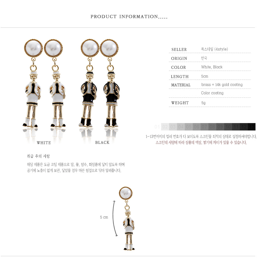 -원산지 : 한국-구성 : 귀걸이-소재 : 골드도금, 컬러코팅, 진주-사이즈 : 길이 5cm, 0.8cm-무게 : 5g (500원 동전 8g 참고 / 귀걸이 낱개무게)