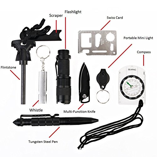 - ➤ Multi Function Tools: Portable waterproof tool case, inside is everything you need to help you survive: fire starter, knife, compass, whistle, saw, multipurpose flash light pliers, tungsten steel pen, key-ring flashlight.