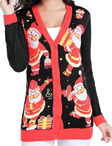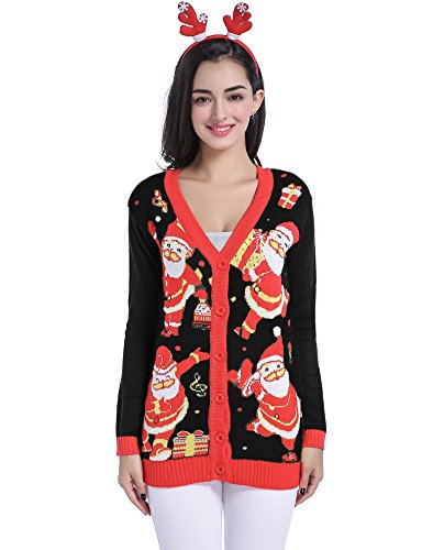 v28 Women Christmas Sweater, Ugly Ladies Girl Happy Santa Xmas Sweater Cardigan (X-Large, DanceSanta Black)