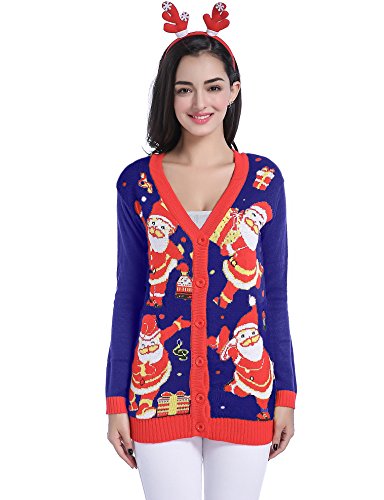 v28 Women Christmas Sweater, Ugly Ladies Girl Happy Santa Xmas Sweater Cardigan (X-Small, DanceSanta NightBlue)