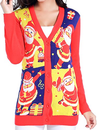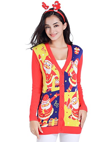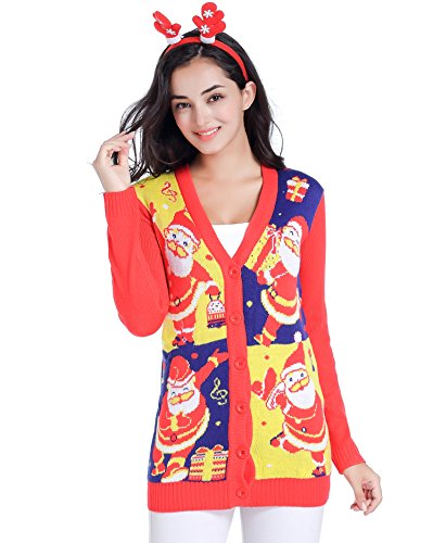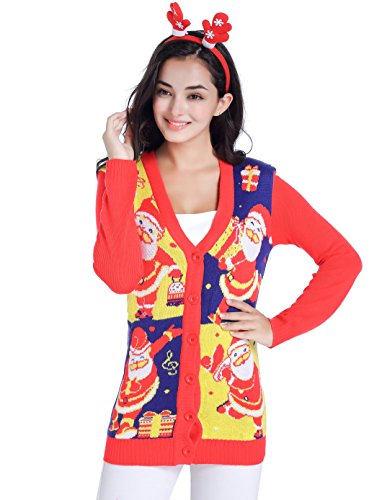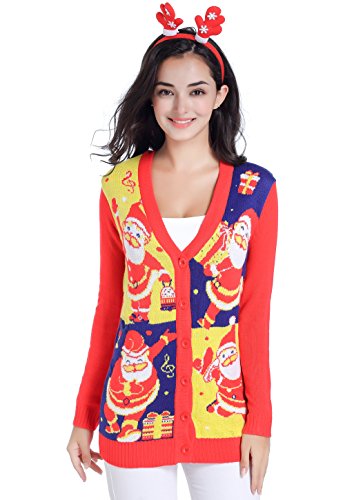 v28 Women Christmas Sweater, Ugly Ladies Girl Happy Santa Xmas Sweater Cardigan (X-Large, DanceSanta Red)