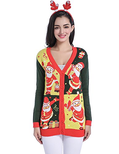 v28 Women Christmas Sweater, Ugly Ladies Girl Happy Santa Xmas Sweater Cardigan (X-Small, DanceSanta Green)