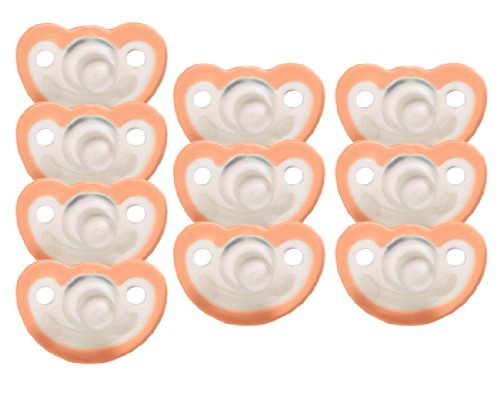 -. Feature : Natural shape, textured nipple babies love; Easy-to-hold loop shaped handle with teething nubs / Soft & flexible - no hard inner guard; Comfortable, curved shape fits baby's face / Safe 100% silicone - won't crack, break or peel / Two-tone baby bright colors / Phthalate-free, latex-free, BPA-free, DEHP-free; This includes: 10 Pacifiers - Unscented, Sealed in a polybag