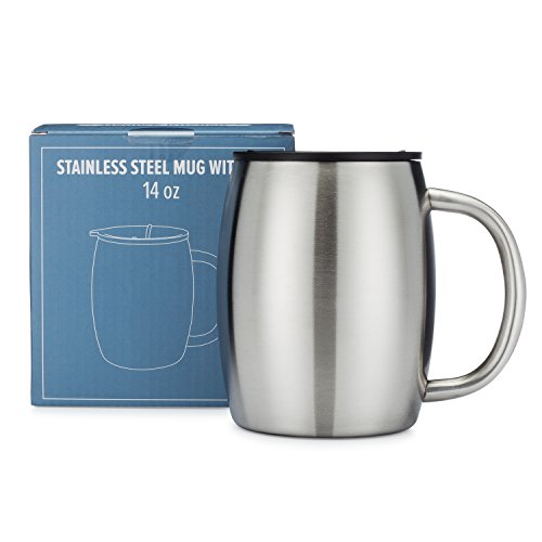 These 100% stainless steel coffee mugs are the perfect choice for using indoors or out. The double-walled construction keeps the contents hot or cold and keeps your hands comfortable. Holds 14 oz, so you can have a big cup of coffee or a full beer.
