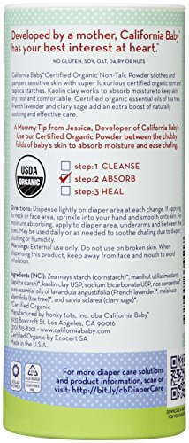 2.5 oz / 75 grams shaker canister. Safe for newborns and older. Use on body and diaper area. Scented with our special Calming aromatherapy blend that includes French lavender. Use our fluffy powder around the diaper area and those chubby folds in the skin! Our silky body powder contains a luxurious level of essential oils to soothe and heal irritated skin. Tea tree works as a powerful anti-fungal, yet it is also very gentle to the skin. California Baby French lavender has a beautifully fresh clean scent and contains anti-bacterial properties. Exceptional ingredients such as moisture-absorbing clays and fluffy cornstarch are blended into a natural balance. Sprinkle over the body to stay cool during the summer and to ease chafing during the dry winter months. No nut oils, gluten, soy, oat or dairy. Made in the U.S.A.Feature