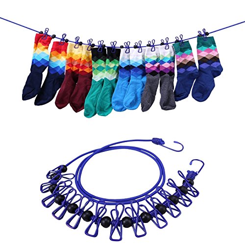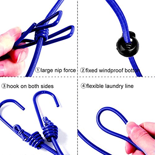 - ☛ELASTIC CORD PROVIDE MOST PORTABLE - The elasticity of the cord is great to use. It is durable and efficient. There are 2 strong hooks on the ends. This unique elastic clothesline helps to make it adaptable to any space. The end hooks could fit onto a knob or be wrapped around something and secured onto the line itself with the hook. It is a very useful device that should be carried when you have travelling or camping. You can probably attach the two hooks pretty much anywhere.