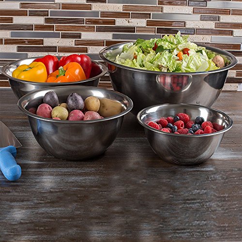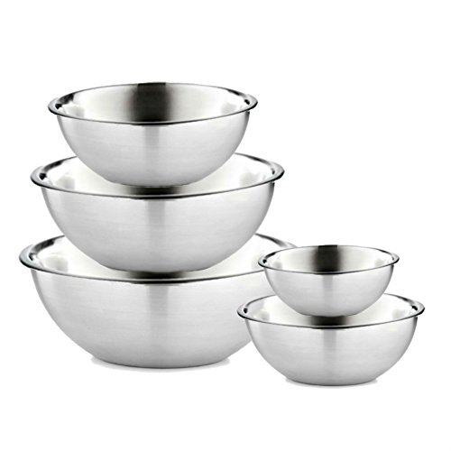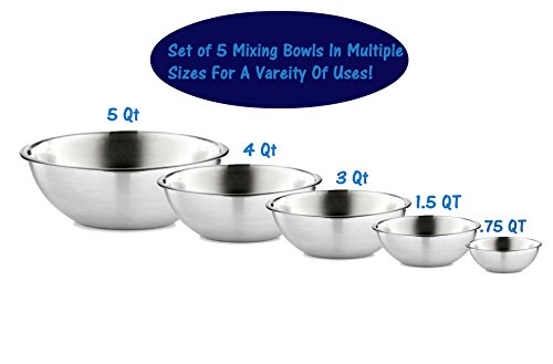 Set of 5 premium quality stainless steel bowls. Graduating sizes of ¾, 1.5, 3, 4, and 5 quart stainless bowls allow for larger servings and less mess! The small metal bowls are great for whisking and beating smaller quantities, while the large metal bowls are ideal for mixing large batters, tossing salads,marinating and storing.