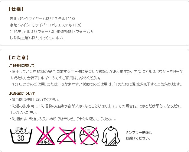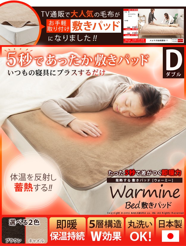 ※メーカー直送のため代金引換はお受けできません。※沖縄・一部離島は別途送料がかかります。お見積もりいたしますのでお問い合わせ下さい。サイズ:幅140x奥行200cm・約0.8kgカラー:ブラウン・キャメル材質:表地-ミンクマイヤー(ポリエステル100%)、裏地-マイクロファイバー(ポリエステル100%)、発熱層-アルミパウダー70%・発熱特殊パウダー20%、放熱防止層-ポリウレタンフィルム完成品株式会社ナカムラ(12600028)