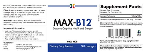 Vitamin B12 is essential for energy production and for keeping the brain and nervous system functioning optimally. Yet deficiencies of B12 are widespread in the U.S., especially among older people. Supplemental B12 is a proven way for people who are deficient to raise their serum B12 to healthy levels. Since vitamin B12 is available almost exclusively from animal products, it is crucial that vegetarians supplement B12 in their diet. People who are using anticoagulant medications should also be sure to supplement vitamin B12, as these medications may block the absorption of B12 in the digestive track. Vitamin B12 comes in several different forms, but only methylcobalamin has been used with consistent results. Methylcobalamin is the type of vitamin B12 that is administered to people with B12 deficiencies. Studies have shown that high amounts of methylcobalamin are needed to regenerate neurons and support the nervous system by protecting the myelin sheath that protects nerves. Our premium grade MAX-B12 formula is made with 100 percent methylcobalamin and features an under the tongue lozenge delivery system, which ensures optimal absorption and maximum benefits. Simply place the small lozenge under your tongue and B12 will be absorbed rapidly and efficiently into your blood stream so that you can get the full benefits of supplementation in less time. Each pleasant tasting lozenge provides 5,000 mcg of active B12. B12 has no known toxicity, so you can safely take more to address a deficiency or as recommended by your healthcare practitioner.Feature