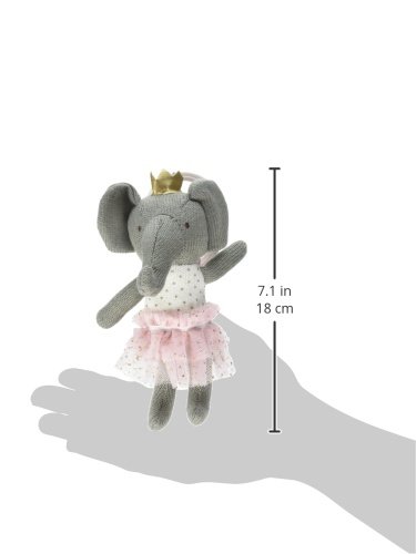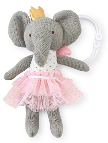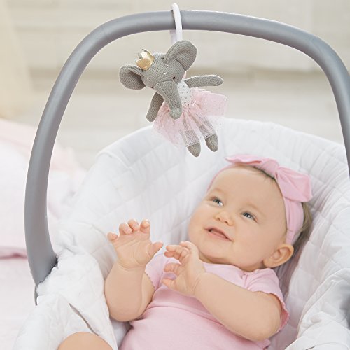 Knit princess stroller buddy features mesh printed tutu and bow, grosgrain ribbon accent, interior chime rattle, embroidered eyes and fabric covered pull strap which activates vibrating rattle with tugging action. Attached with a plastic ring clip.Feature