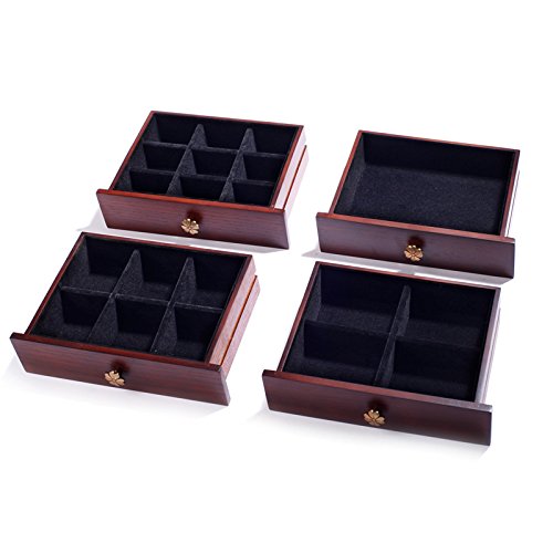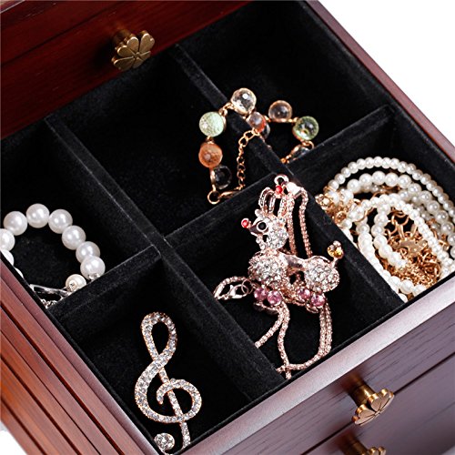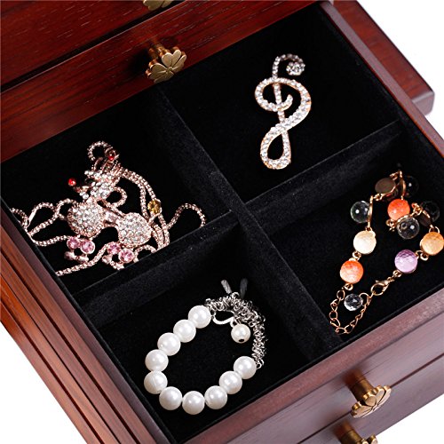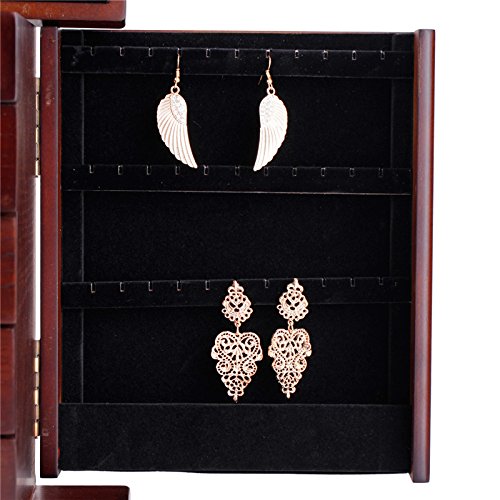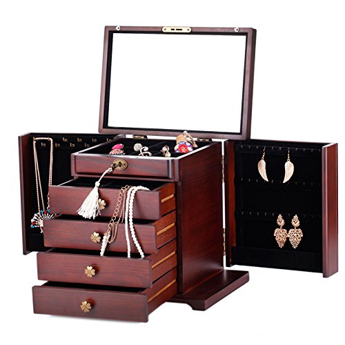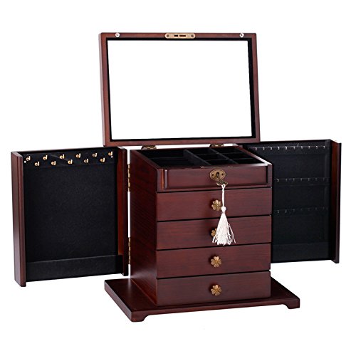-. Feature : Size: 11.8 inch * 8.1 inch* 10.8 inch (L*W*H) / * lid open with a large mirror for wearing jewelries * 1th layer can be divided into 2 major parts,1 for ring rolls compartment and the other for beads compartment, each of them could be taken out separately by sliding / * the 1th drawer(8.27L*7.48W*1.38 inches) can't not be pulled out, but could storage jewelries by taking out the 1th layer,it is divided into 9 small compartments *the 2th drawer(8.27L*7.48W*1.38 inches) pulls out with 6 compartments for pins and trinkets / *the 3th drawer pulls out with 4 compartments while the 4th with no compartments for storaging some other large bracelets,watch or brooches *the designs of the side open doors are different, the left one has 11 hooks and 1 bottom compartment for dangling necklace while the right side with 4 wood splint to hold more necklaces / *key for safe closure and soft velvet to protect all your jewelries well !