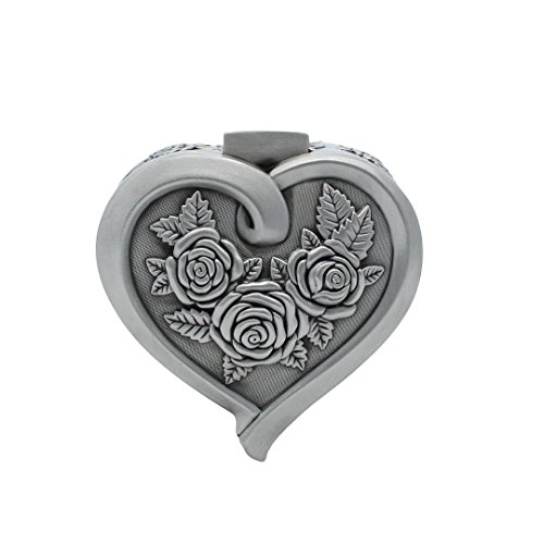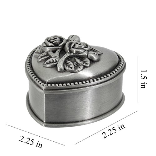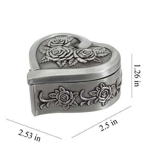 -. Feature : Crafted from Zinc Alloy with velvet lining interior, tiny design looks so adorable / Antique Heart Shape Silver jewelry Box with Rose Engraved Decoration, A great gift to someone special for wedding, birthday, mother's day or graduation gift / Size: Heart shape 1: length: 2.36inches, width: 2.2inches, height: 1.57inches; Round shape 2: length: 2.24inches, width: 2.24inches, height: 1.42nches; Heart Shape 2: length: 2.68inches, width: 2.52inches, height: 1.33inches; Heart Shape 3: length: 2.36inches, width: 2.36inches, height: 1.38inches; Butterfly: length: 2.17inches, width: 2.36inches, height: 1.18inches, please notice the size before order / A perfect organizer to store your accessories, jewelry, trinkets and keepsakes, also a perfect jewelry case for your home décor / Once ordering for any of 3 jewelry boxes, will send a free P.R.Inted scarf along with