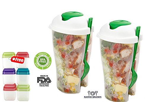 Fresh Salad To Go Serving Cup - FREE 6 Piece Set of Portion Packers and Bonus Recipes - Salad Shaker With Dressing Container Fork
