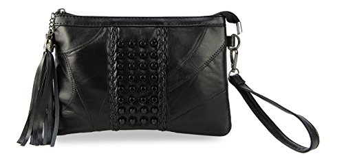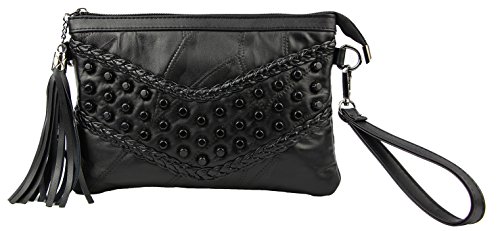 Black Punk Rivets Braided Clutch Handbags CrossBody Purse with Tassel Zipper Material: Faux sheepskin