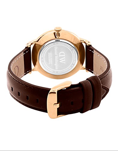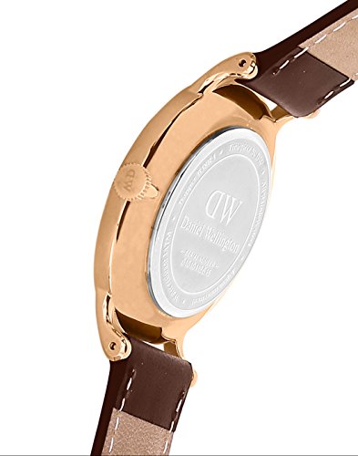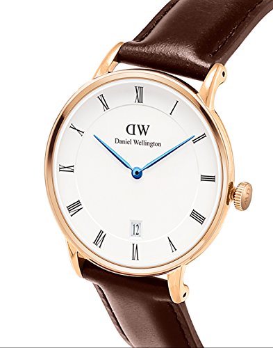 Rose gold-tone stainless steel case with a brown leather strap. Fixed rose gold-tone bezel. White dial with blue steel hands and Roman numeral hour markers. Dial Type: Analog. Date display at the 6 o'clock position. Quartz movement. Scratch resistant mineral crystal. Pull / push crown. Solid case back. Case size: 38 mm. Round case shape. Deployment with push button clasp. Water resistant at 30 meters / 100 feet. Functions: date, hour, minute, second. Casual watch style. Daniel Wellington Dapper Bristol White Dial Unisex Watch 1133DW.Feature