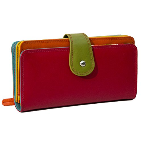 * Snap closure on the leather tab, 1 id window, 2 side slip pockets, * It has 2 inches gusseted, has 12 card slots, 2 bill compartments with divider, zipper pocket, * Back zipper pocket, silver hardware, contrast stitches. * Fully lining. Genuine leather. * Dimensions : 7 x 3 1/2 x 3/4 approx * Color : Multi "fun" Color (Mixed 5 different colors : Red, Orange, Green, Aqua, Yellow & Bone)Feature