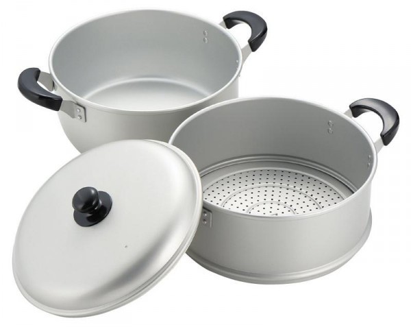 アルミ鍋は熱伝導が高く、同サイズの鉄製鍋に比べて軽くて使いやすいのが特徴です。表面は薄いアルマイト被膜を作る処理(アルマイト加工)を施してあるので酸化・腐食しにくく、光沢も長持ちします。もち米を蒸せる目安は約2升です。 |