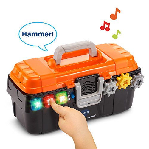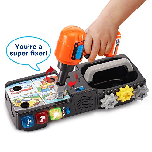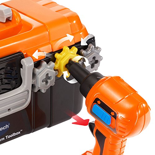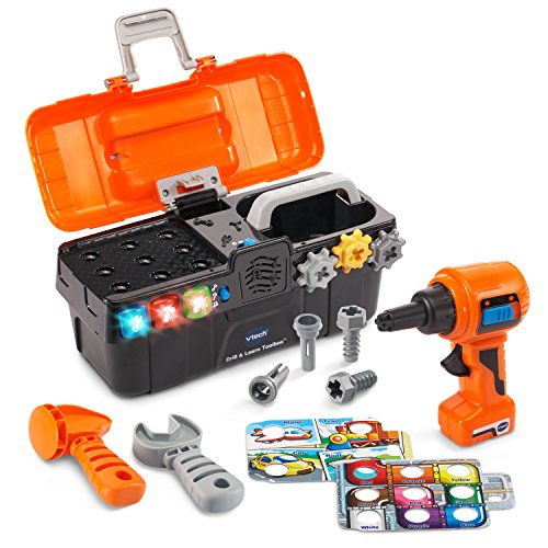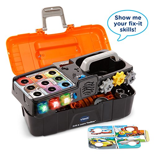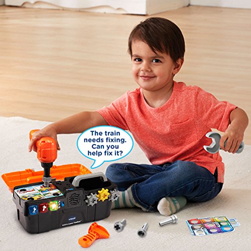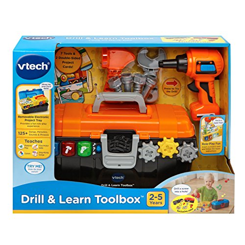 Fix and play with this Online Exclusive Drill and Learn Toolbox by VTech; open this toddler-friendly toolbox and get ready for role-play fun with the included electronic fix-it tray, working toy drill, hammer, wrench, nails and screws