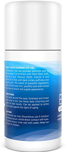 -. Feature : Youth Express Eye Gel contains a potent combination of ingredients for maximum results. Hyaluronic Acid hydrates the skin and plumps it up with moisture, while Matrixyl 3000 firms the skin and Plant Stem Cells enhance its strength to protect against sun damage and other external aggressors / Diminishes Dark Circles & Puffiness - This gel provides all around care and protection to the eye area. This powerful formula will help reverse the signs of aging and revert your skin back to its natural youthfulness. It will help you tackle dark circles, eye bags, crow's feet, fine lines, sagginess and puffiness so you can obtain a healthy and radiant appearance. / Safe and Natural Ingredients - We are proud to use natural ingredients in our product with NO parabens, sulfates or alcohol. It is also full of organic ingredients and safe to use on ALL skin types. / Apply to your cheeks and forehead as well to moisturize your skin and prevent premature aging. Improve your tone and texture to attain a smooth and brilliant complexion. / Manufacturer Warranty - InstaNatural backs their products with a Lifetime Money Back Warranty, no matter where you buy our product. If you're not satisfied, just contact InstaNatural for a full refund.