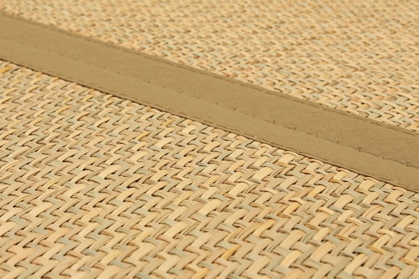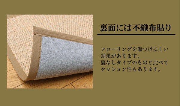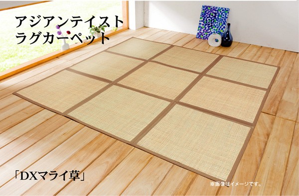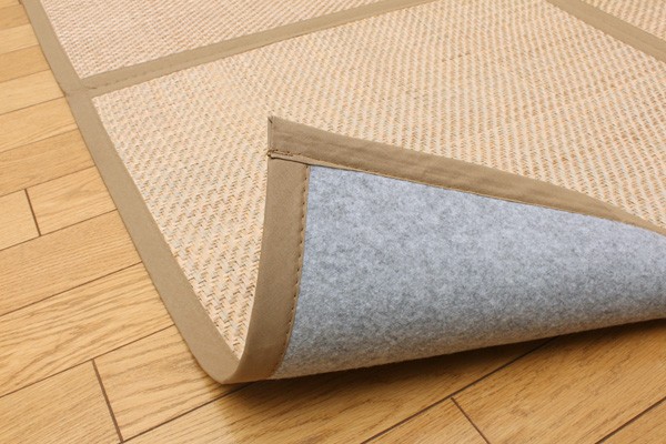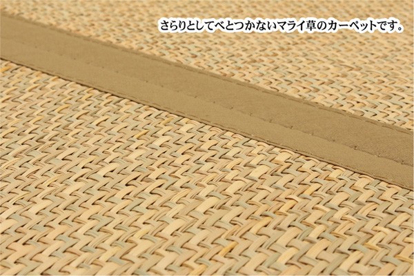 マライ草を編み込んだアジアンテイストなラグカーペットです。通気性が良く、サラッとしていてベトつかないのが特徴です。コンパクトに折りたたむことができるので収納にも便利です。フローリングを傷つけにくいよう、裏には不織布を貼っています。