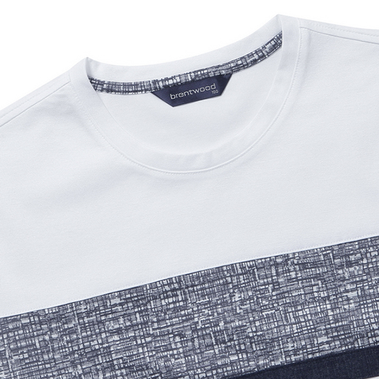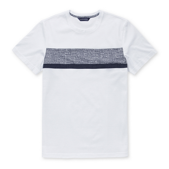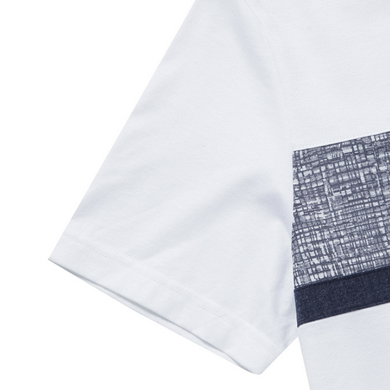 - 다른 조직감의 투톤 배색을 패치한 남성 티셔츠.