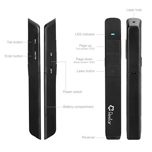 One-touch keys easy to control slideshow. Buttons: laser pointer, page up, page down, TAB, enter.