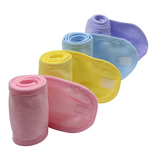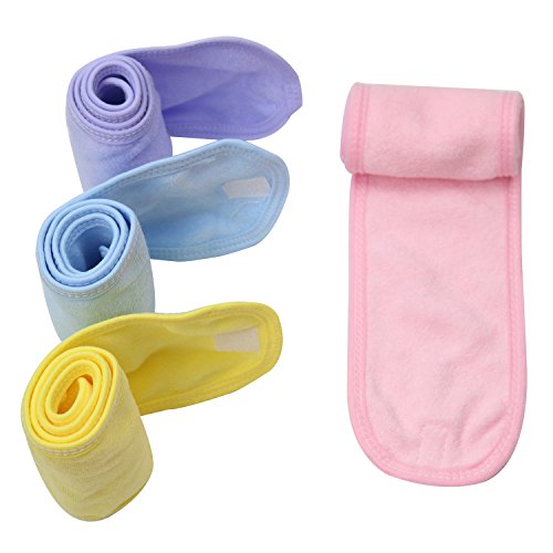 - PACKAGE CONTENT- 4 pack facial headbands with velcro, black,white,pink,blue,yellow,green,6 colors. Please note that for technical reasons, black and white headbands are relatively thick.