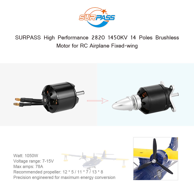 The original SURPASS 2820 1450KV brushless motor is designed to provide both quality and performance at an affordable price. It is built from high quality aluminum alloy which is produced from the latest CNC milling machines, and is designed with high power and rotation speed to provide longer run time for RC airplane fixed-wing.