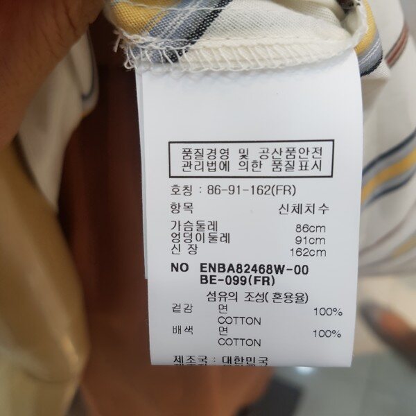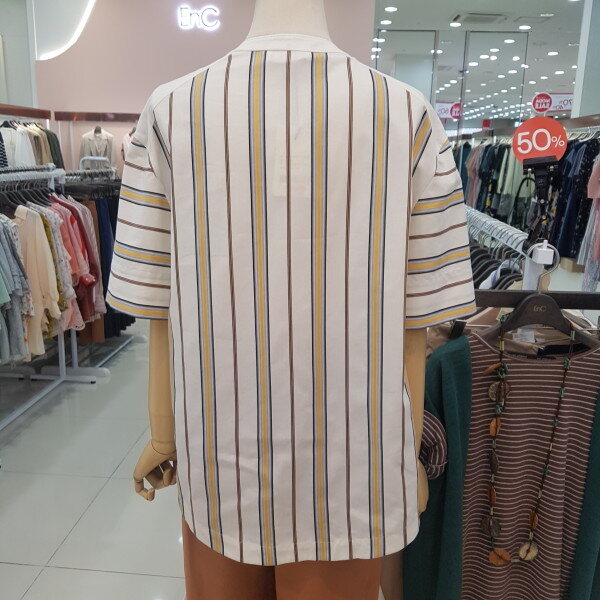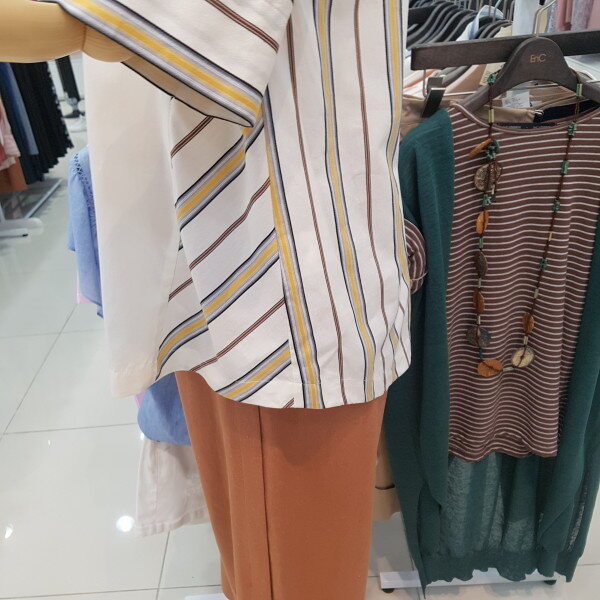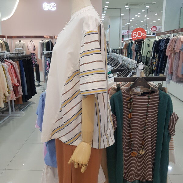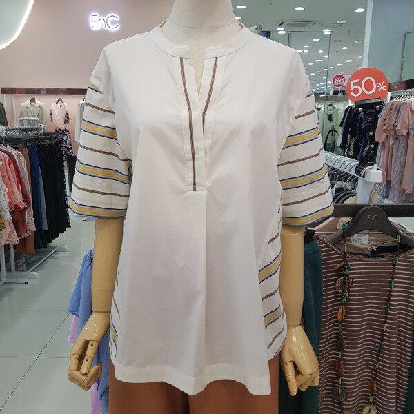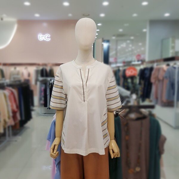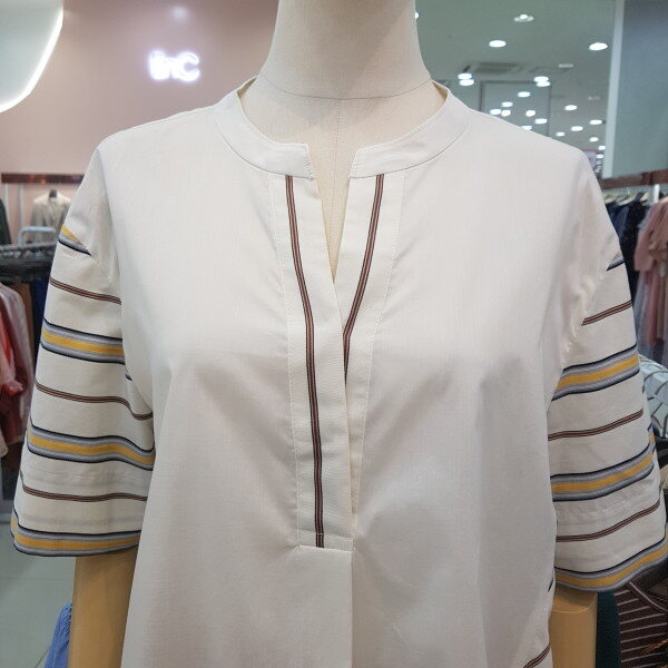면100 %에 살짝 A라인의 블라우스로 백라인의 스트라이프가 세련된분위기를 만들어낼수 있는 아이템