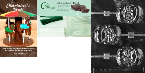Cybrtrayd 45stK25GRBk-C036 Santa Face Lolly Chocolate Mold with Chocolatier's Bundle of 25 Lollipop Sticks, 25 Cello Bags, 25 Green Twist Ties and Chocolatier's Guide