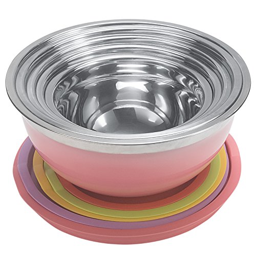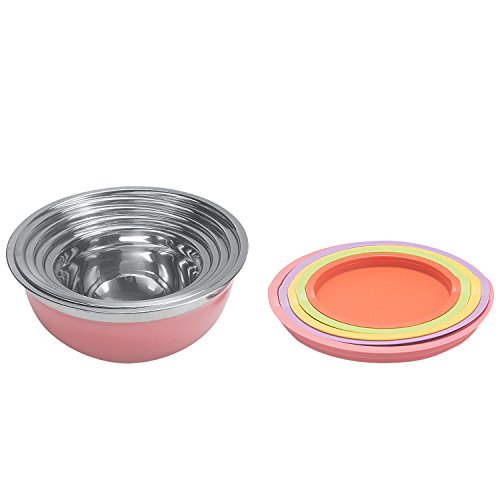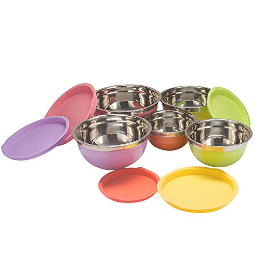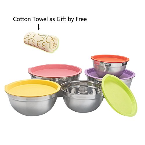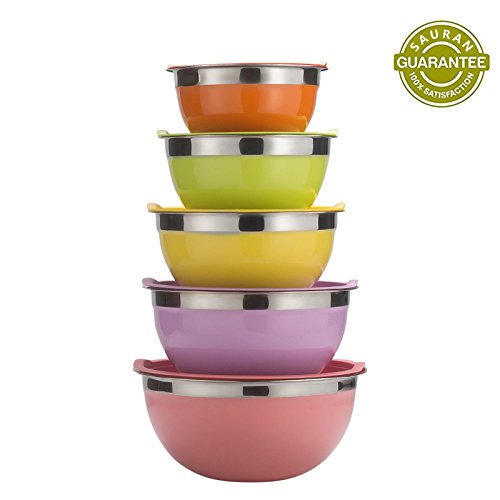 Studio : Sauran Publisher : Sauran Product Description CHOOSE SAURAN, IS THE CHOICE OF QUALITY! Ideal Kitchen Utensil to Measure, Mix, Store in same bowl. SAURAN's stainless steel mixing bowl is a multipurpose kitchen tool, designed to last like new for lifelong! Use it efficiently for tossing a salad, mixing the cake mix, pizza dough, marinating, soaking, baking mix and much more. Advantage: ●High quality stainless steel, highly resistant to stain, rust, corrosion while maintaining the shine and looks. ●No more ugly scratches: Matt finish inside and outside prevent those scratches caused while mixing using tools. ●No Slips, Firm Grip: Flat silicone bottom that curves around to provide non-slippery and stable base while mixing. ●Easy Measurement: Metric scales in liters and quarts inside the bowl for easy measurement of contents. ● Easy Pouring: Provision of spouts for easy pouring of mix! ●Convenience: Stackable, Nesting bowls for convenient storage. ●Store For Freshness: BPA-free flexible tight fit lids to keep food fresh, always! ● Hassle Free Usage: Dishwasher safe, Freezer and Refrigerator safe. ● Looks Great: The polished mirror finish on the stainless steel mixing bowls adds a luxurious aesthetic to your kitchen! ●Best Gift: Best gift for family, friends and loved ones. Dimensions: Bowl 1 - Diameter 7" - 1.5 Quart Bowl 2 - Diameter 7.9" - 2 Quart Bowl 3 - Diameter 8.7" - 3 Quart Bowl 4 - Diameter 9.5" - 4 Quart Bowl 5 - Diameter 10.2" - 5 Quart Package including: ● 5 Piece of SAURAN Mixing Bowl ● A towel as a gift