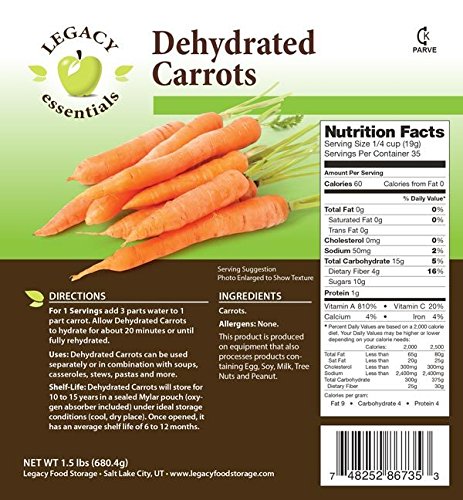 - Feature : Freeze Dried Carrots - 35 Servings - 2100 Total Calories Per Pouch - Serving Size 1/4 Cup - 1.5 Lbs Per Pouch / Voted Best Tasting - 15 Year Shelf Life - Legacy Essentials / Compare Legacy to other food storage products: Lowest cost per day (2000 Calories) - Lowest cost per pound of food / GMO Free - 15-year shelf life - Double thick Mylar pouch with an oxygen absorber and nitrogen flush / Made in the USA - Makes a Great Snack - Perfect for Hiking, Backpacking, Camping, or Long Term Emergency Prepartations