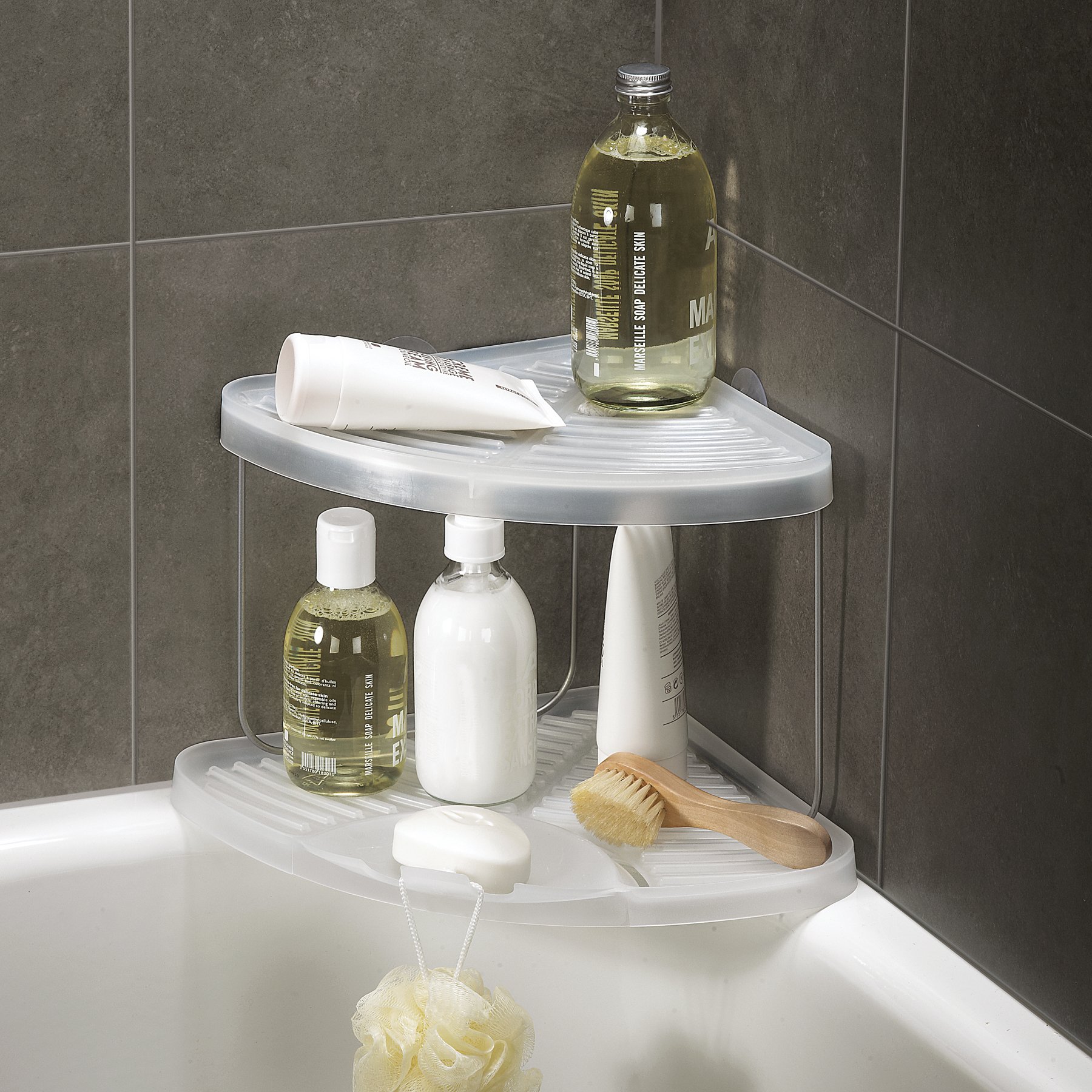 ● Perfect for corner of bathtub, shelf with easy attachment with suction cup behind