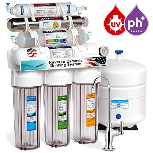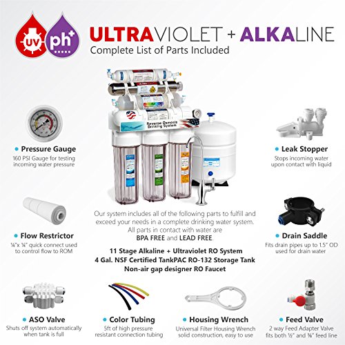 11 Stage Reverse Osmosis System 4 Gallon NSF approved Storage Tank Non-air gap designer RO Faucet Leak Stopper Drain Saddle Color Tubing Flow Restrictor ASO Valve Feed Valve Housing Wrench Pressure Gauge