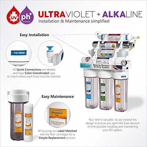 6th Stage: UV Ultraviolet Light Sterilizes and sanitizes the water to effectively eliminate up to 99.99% of cysts, viruses, micro-organisms and harmful bacteria such as E. Coli, Fungi, Algae, etc.