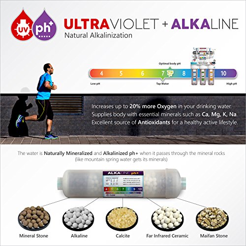 5th Stage: Alkaline Remineralization 5 Stage Inline Increases up to 20% more Oxygen in your drinking water. Supplies body with essential minerals such as Ca, Mg, K, Na. Keeps your body's pH level balanced with pH water. Boosts Energy and Hydration levels with micro cluster technology.