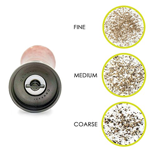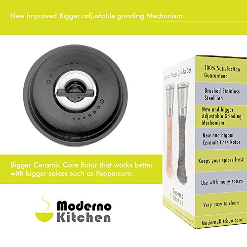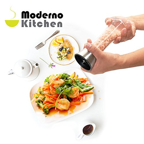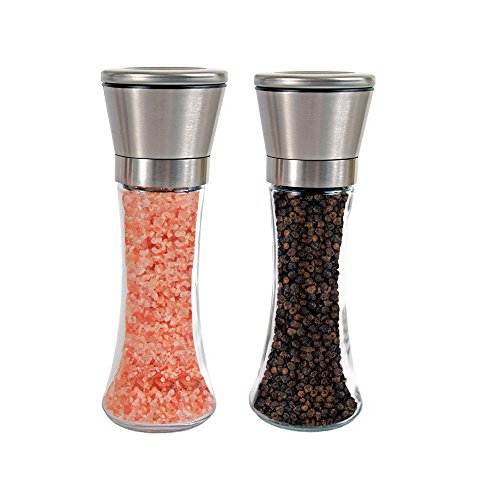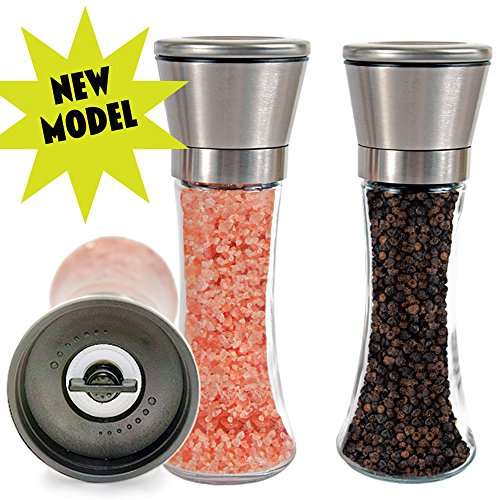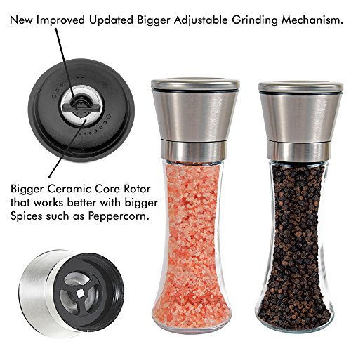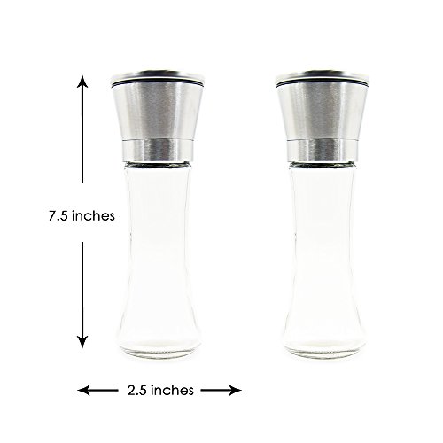 Modern Stainless Steel Salt and Pepper Grinder Shakers Set of 2, with Premium Brushed, Adjustable Ceramic Rotor, and a Tall 6 oz Glass Bottle