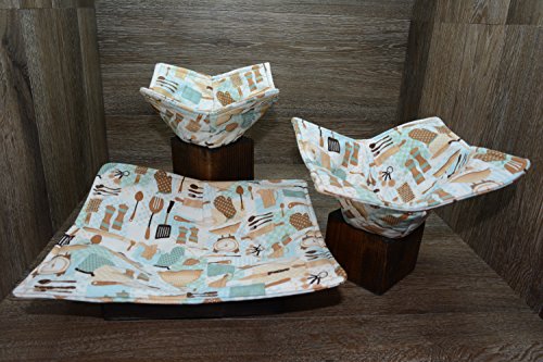 Product Description Microwave cozy set includes 1 small bowl cozy (Approx 6.5" sq), 1 medium bowl cozy (Approx 8" sq), 1 dinner plate cozy (Approx 10" sq.) The dinner plate cozy can also be used for round casserole dishes and the small size is great for coffee mugs! These microwave cozies are the perfect solution to handling super-hot dishes. Cooking and reheating food in a dish cozy makes life so much easier! Place your microwaveable dish inside the bowl cozy and put the whole thing in the microwave to heat. To take the bowl out, you simply grab the corners of the cozy. We found that our kids can now get their dishes out of the microwave safely. Cozies will also protect your fingers from the cold when holding a bowl of ice cream and are great for protecting your table. You can also use a cozy placed on top the dish you are microwaving to help steam food. MATERIALS: * 100% cotton fabric * 2 layers of 100% cotton batting * 100% cotton thread Please be advised: Bowl cozies must only be used in microwaves with a rotating base. To avoid scorching or burning, please make sure cozy freely rotates in your microwave. Never leave microwave unattended. Make sure cozy is clean with no pieces of food attached. Do not microwave cozy for more than three minutes. Cozies can be machine washed on delicate cycle. Reshape and allow to air dry for best results. Please let us know if this is a gift, and we will ship without a packing slip enclosed! 0