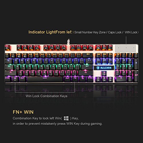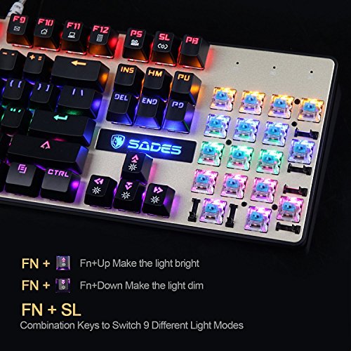 -. Feature : Good feeling:ergonomically curved Keycaps, smooth lines. Hundreds of professional gamers to participate in the competition test.Very Comfortable operation feeling . 6pcs Wearable TPF rubber pad to ensure that the keyboard does not slide and in the meantime do not leave scratches on your desktop / Beautiful colors:ABS double-color injection molding and constructed with floating keycaps,Uniform light transmission and 9 kinds of Brilliant Backlit effect.Definitely eliminating Keycaps data fade. / Gold-plated USB universal interface: flexible and transparent braided cable. Anti-knotted, anti-pull, anti-bite.Plus ultra-long lifetime durability, perfect for all gamers. / No driver needed:Blue Switches is the core of the SADES K10 Mechanical Gaming Keyboard,Strong sense of rhythm and powerful clicking sound.Making you feel super cool and hyper-reality gaming world.Press FN+SL entering different backlight mode.Enjoy more Mechanical Gaming Keyboard fun . / Universal PlatformsIt: is19 anti-ghosting keys for all systems, perfect signal quality no matter how fast you click. 104 keys on the keyboard is specially designed keys for enhanced durability and tactile feedback.FN+Windows is Combining function keys for Lock / unlock function for WINDOWS key to avoid miss clicks / distractions during gaming.