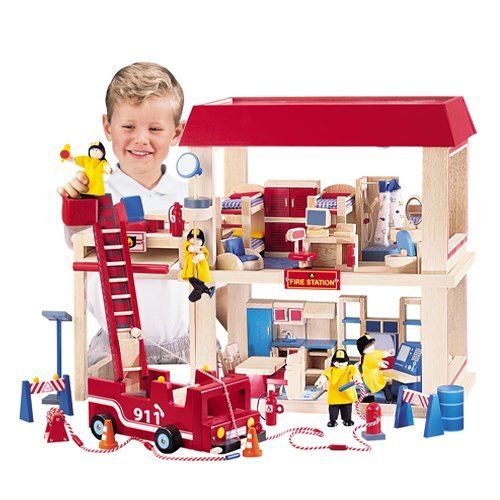 -. Feature : The set includes an all hardwood two-story firehouse, four posable firefighters, an wooden fire truck with movable extension ladder, a pole to slide down, and furniture and equipment to fill it up / Measures 27 ½" w. X 11 ½" d. X 21 " h / 54 pc. Set / Ages 3 yrs. +