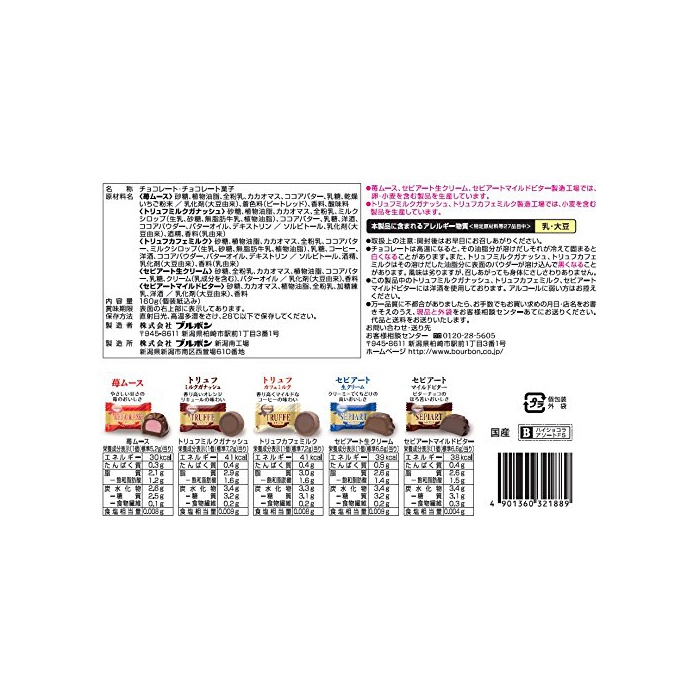 원재료:설탕,식물성 기름지,전분유,카카오 마스,코코아 버터,유당,건조 딸기 분말/유화 제(대두 유래),착색료(비트 레드),향료,신맛료 설탕,식물성 기름지,카카오 마스,전분유,밀크 시럽(생젖,설탕,무지방 우유,식물성 기름지),코코아 버터,유당,양주,코코아 파우더,버터 오일,덱스트린/솔《비토루》,유화 제(대두 유래),주정,향료(유유래) 설탕,식물성 기름지,카카오 마스,전분유,코코아 버터,밀크 시럽(생젖,설탕,무지방 우유,식물성 기름지),유당,커피,양주,코코아 파우더,버터 오일,덱스트린/솔《비토루》,주정,유화 제(대두 유래),향료(유유래) 설탕,전분유,카카오 마스,식물성 기름지,코코아 버터,유당,크림(유성분을 포함한다),버터 오일/유화 제(대두 유래),향료 설탕,카카오 마스,식물성 기름지,전분유,가당연유,양주/유화 제(대두 유래),향료