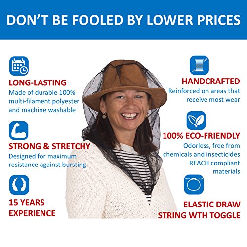 PROTECT YOURSELF THE NATURAL WAY: This Head Net gives you great protection against the tiniest mosquitos, other insects and related diseases. No bug spray needed on your face and head skin. You can relax knowing the extra fine mesh (225 holes/inch2) and non-impregnated fabric serve as a natural mosquito repellent and allow good air circulation. Also a great help while traveling.