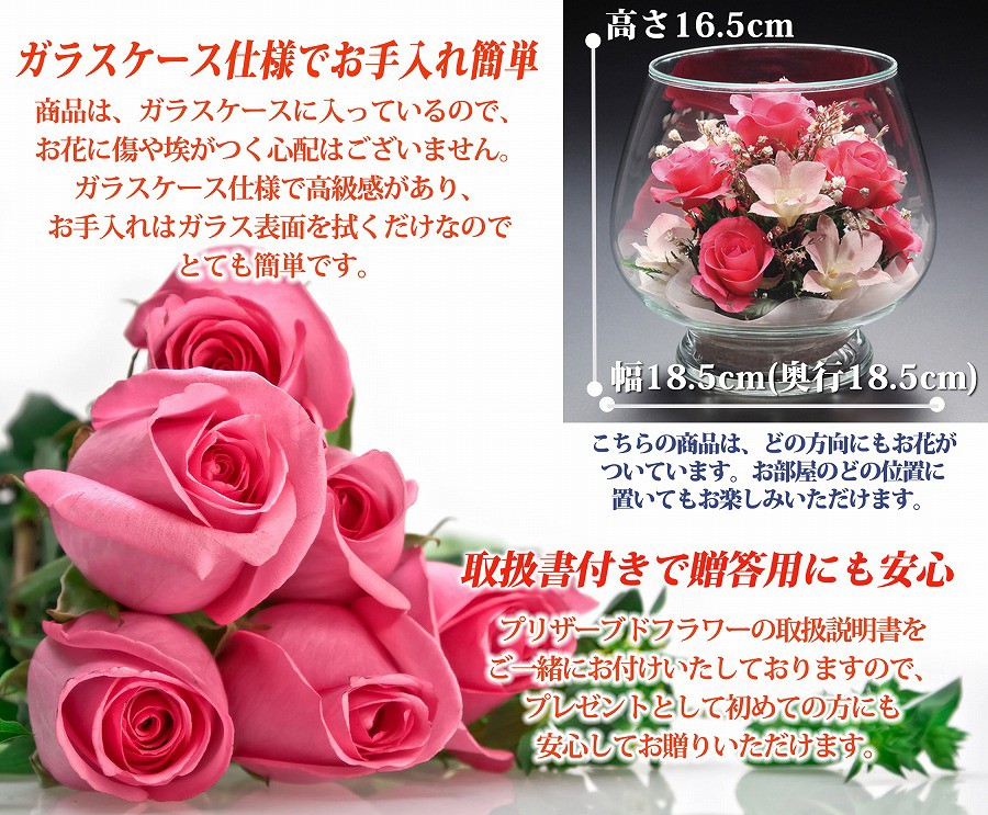 ■ブリザードフラワー ピュアフラワー(バラ・ラン・ミックスタイプ)■★送料無料★■特殊加工を施した本物の花たち使用している花は、特殊加工を施した『本物の花』永く咲き続けます。心和み・癒す「インテリア」として、お部屋の彩りに最適です。■特長・生花(本物の花)を使用・本物のお花の美しさをより永く楽しめるようにガラスケース入りでアレンジメントしました。 ・母の日 誕生日・記念日等のあらゆる場面でのギフト商品としてお薦めです。 ■注意点・ガラスを使用しているので、取り扱いにはご注意ください。・変色の原因となりますので、直射日光と湿度の高い場所は避けて下さい。・実物と色や形が異なる場合があります。★こちらの商品は常温(佐川急便またはゆうパック)で発送いたします★★送料無料です★★クール商品と同梱の場合はクール発送となります★■サイズ:H16.5×W18.5×D18.5cm ■他店舗でも販売しておりご注文時に在庫が切れている場合がございます。納期に1週間ほどかかることがありますのでご了承ください。ガラスドーム preserved flower