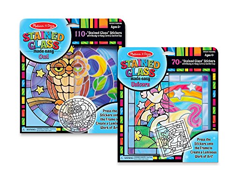 These pack of two peel-and-press sticker crafts gives kids everything they need to easily create spectacular "stained glass" works of art. Just hold up the sheet of colored textured stickers to the clear frame, peel them off one at a time, and stick them on. Grooves and outlines on the frame make it easy to fit each sticker into just the right spot. Use the included cord and suction cup to hang the finished artwork in a sunny window to see the charming owl (8.5" x 8.5") and the magical unicorn (7" x 7") shimmer to life. Artists four and older will be enchanted by the results and proud to show them off!.Feature