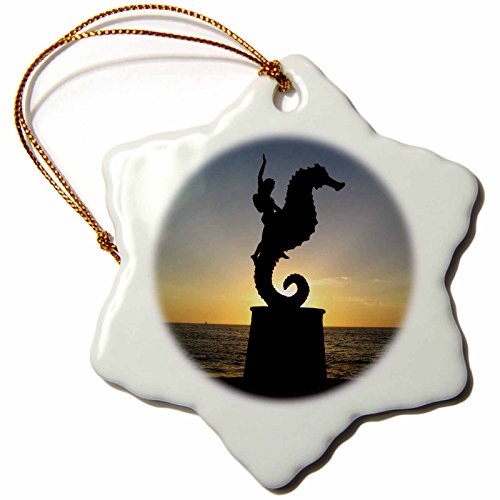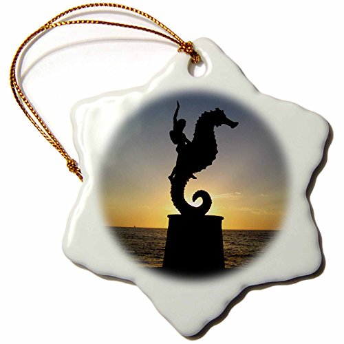 3dRose LLC orn_18563_1 Puerto Vallarta Malecon Boy on Seahorse Statue Silhouetted Against Sunset Snowflake Porcelain Hanging Ornament, 3-Inch